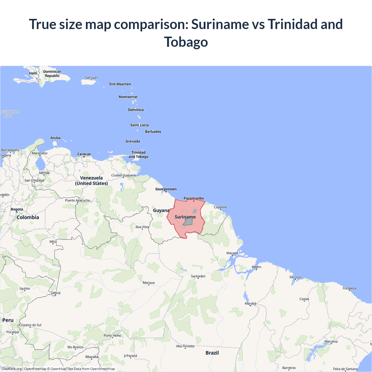 The map above outlines the borders of Suriname and Trinidad and Tobago but is not accurate for size comparison because it's a 2d map with Mercator projection that distorts territories near the poles. The farther a country is from the equator, the more magnified it appears. More about country size projections.