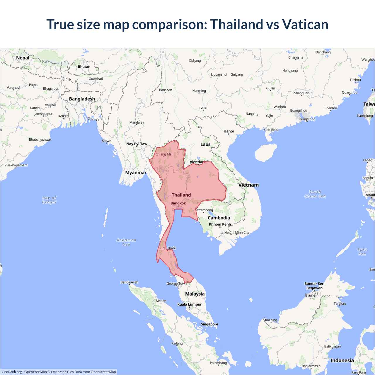 The map above outlines the borders of Thailand and the Vatican but is not accurate for size comparison because it's a 2d map with Mercator projection that distorts territories near the poles. The farther a country is from the equator, the more magnified it appears. More about country size projections.