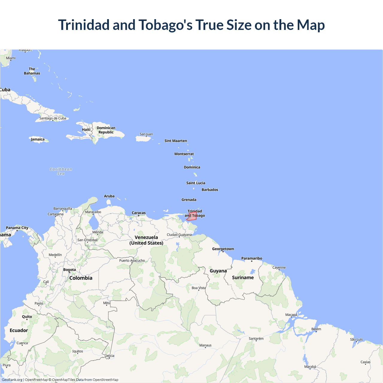The map above outlines the borders of Trinidad and Tobago but is not accurate for size comparison because it's a 2d map with Mercator projection that distorts territories near the poles. The farther a country is from the equator, the more magnified it appears. More about country size projections.