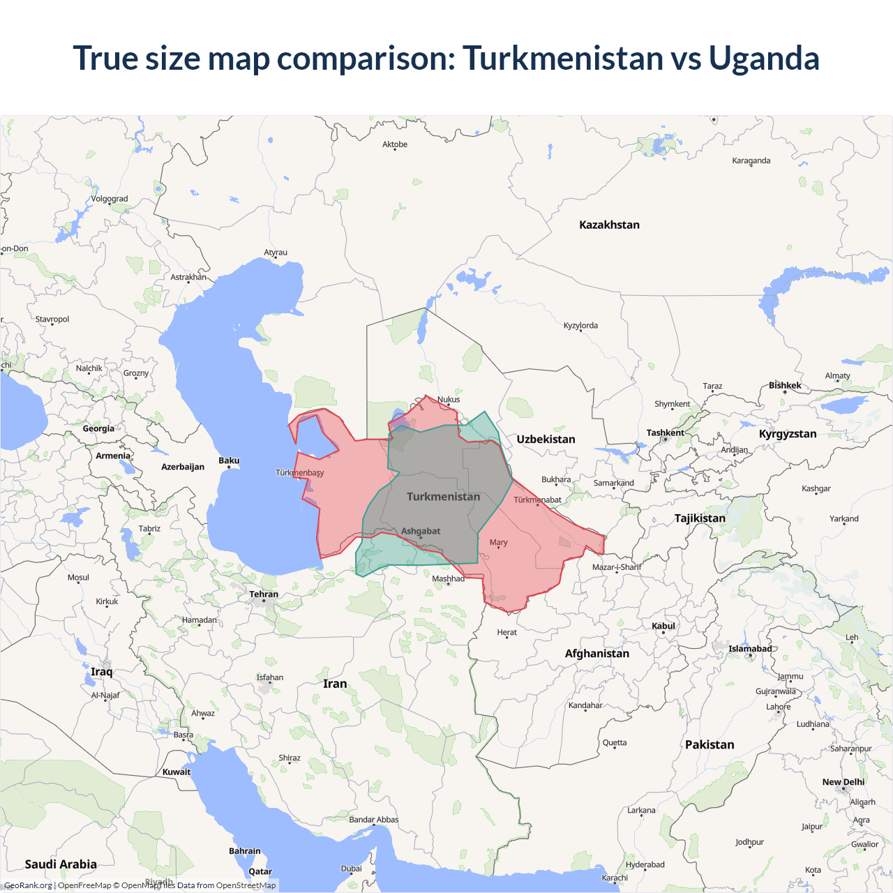 The map above outlines the borders of Turkmenistan and Uganda but is not accurate for size comparison because it's a 2d map with Mercator projection that distorts territories near the poles. The farther a country is from the equator, the more magnified it appears. More about country size projections.