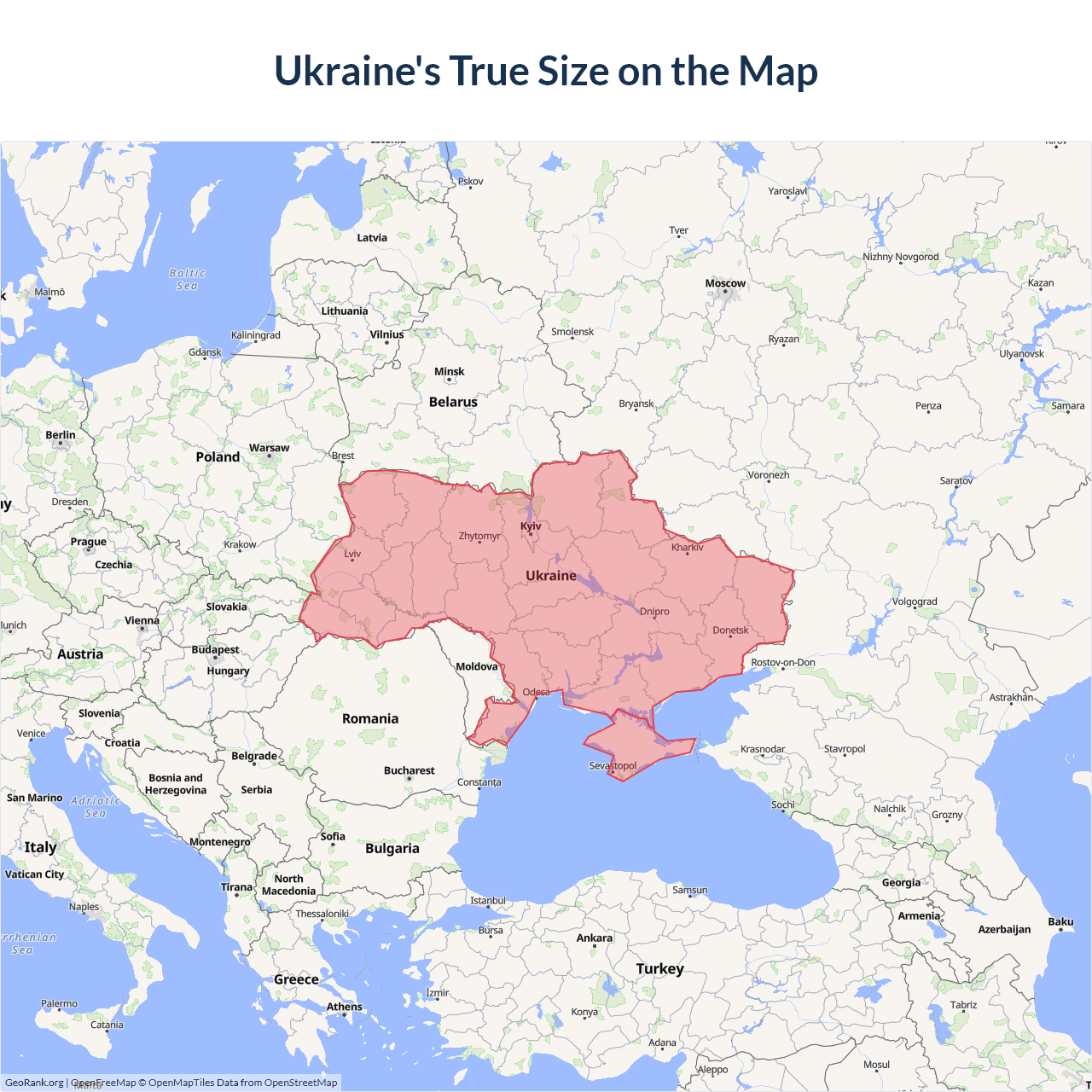 The map above outlines the borders of Ukraine but is not accurate for size comparison because it's a 2d map with Mercator projection that distorts territories near the poles. The farther a country is from the equator, the more magnified it appears. More about country size projections.