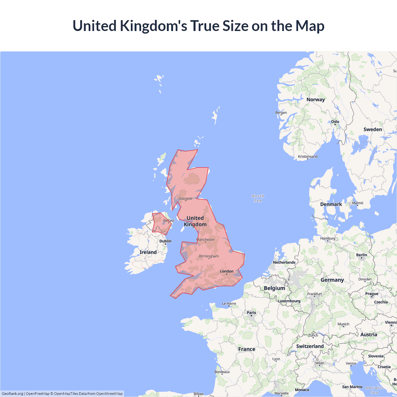 The map above outlines the borders of the United Kingdom but is not accurate for size comparison because it's a 2d map with Mercator projection that distorts territories near the poles. The farther a country is from the equator, the more magnified it appears. More about country size projections.