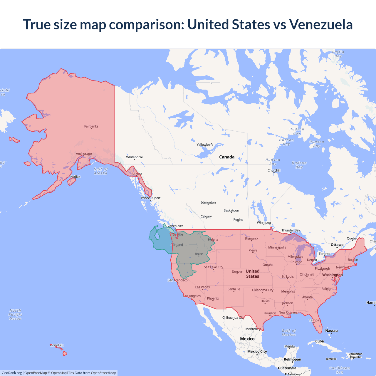 The map above outlines the borders of the United States and Venezuela but is not accurate for size comparison because it's a 2d map with Mercator projection that distorts territories near the poles. The farther a country is from the equator, the more magnified it appears. More about country size projections.