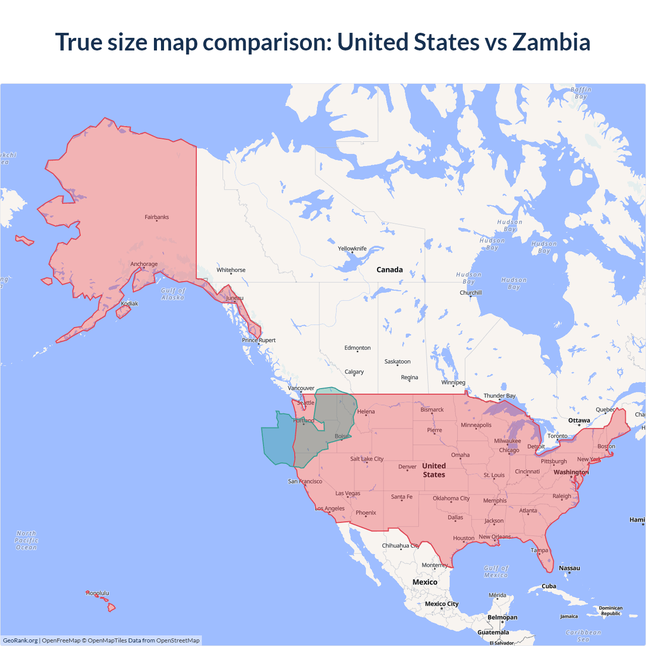 The map above outlines the borders of the United States and Zambia but is not accurate for size comparison because it's a 2d map with Mercator projection that distorts territories near the poles. The farther a country is from the equator, the more magnified it appears. More about country size projections.